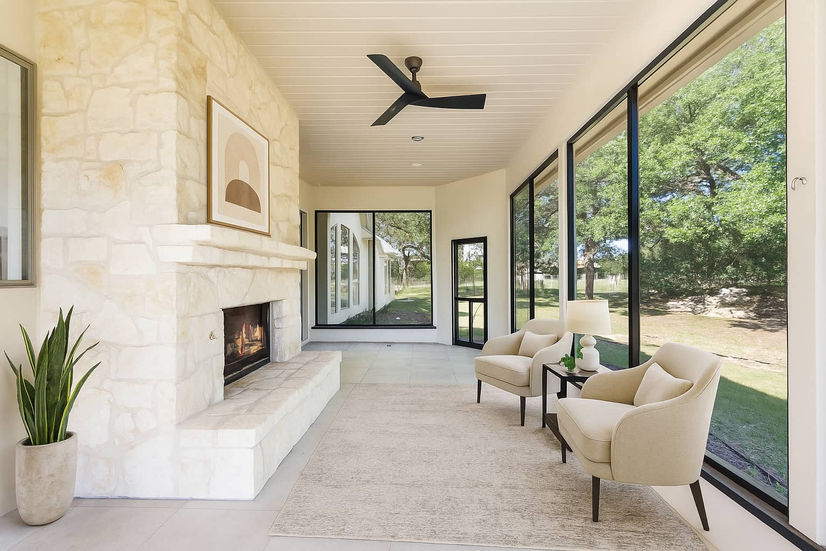 The serene backyard is ideal for year-round al fresco enjoyment. The wraparound screened-in patio features a floor to ceiling stone fireplace and flexible spaces for living, dining and playing your favorite games with family and friends. This comfortable space overlooks the park-like grounds boasting a plethora of mature trees and canopies, an original ranch stone water trough and a decorative windmill. The sprawling lawns are perfect for leisure and play for all!