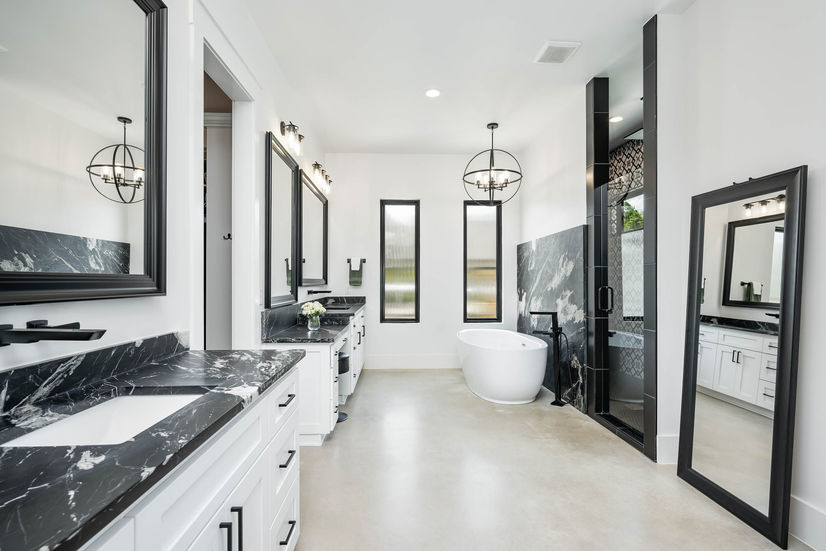 Spa-infused bath features separate vanities, sitting vanity, free-standing tub and a walk-in shower with detailed tile finishes and multiple showerheads